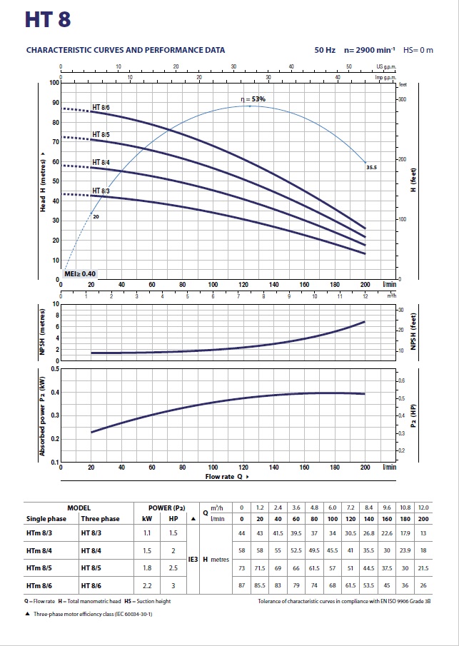 Műszaki adatok – PEDROLLO HT Többlépcsős Centrifugális Szivattyú