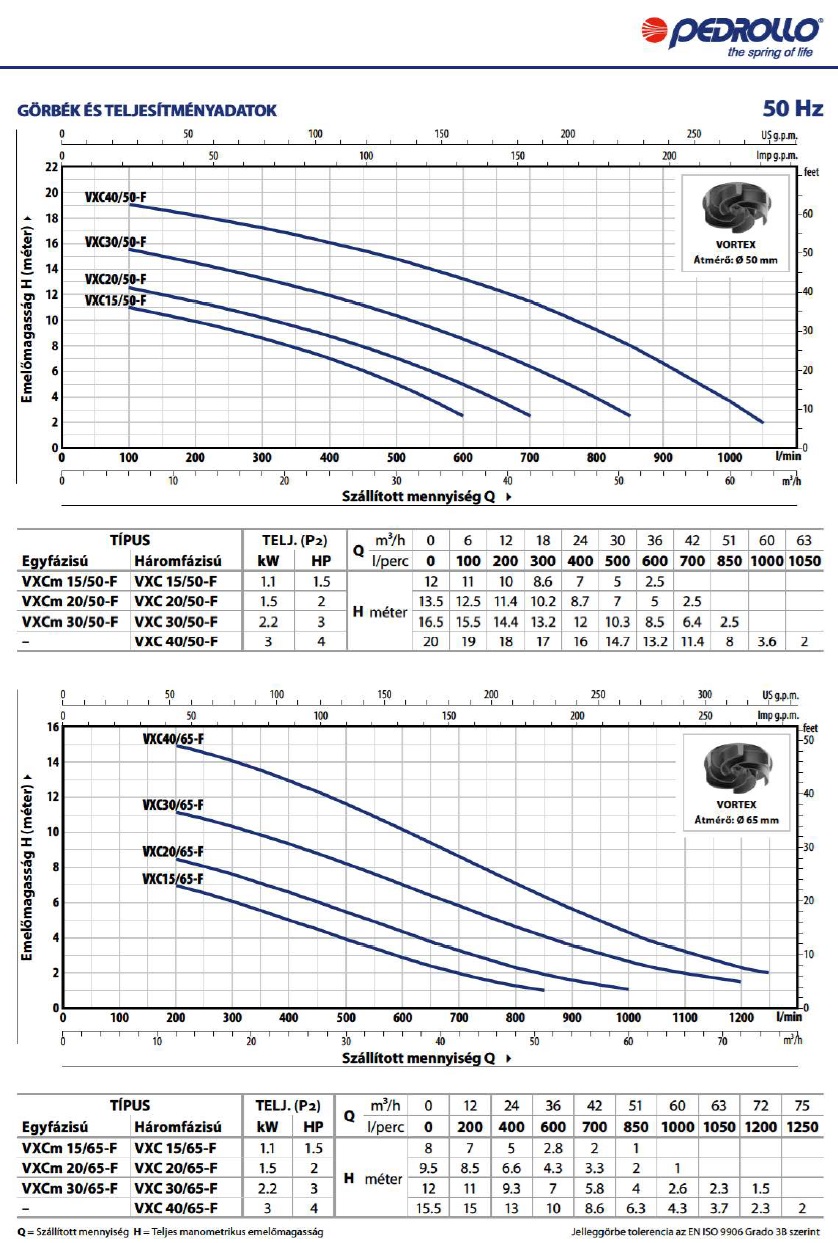 Maximális szállítási teljesítmény (Q): 700 liter/perc (42 m³/óra)